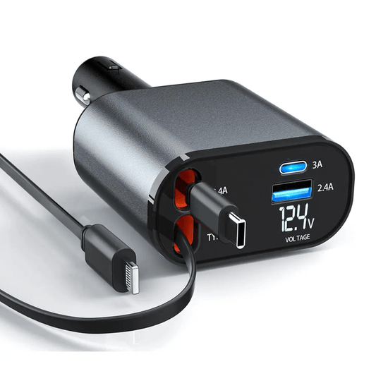 Cargador de Auto retráctil para teléfono - Carga rápida - Iphone y Android - Usb, Lightning typo C