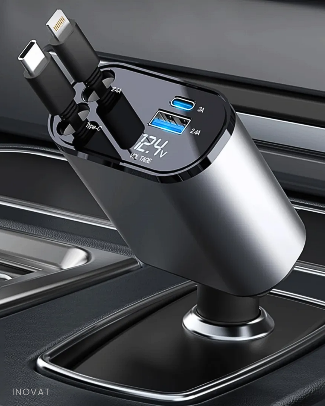 ¿Estás buscando la carga más rápida y eficiente para tus dispositivos mientras conduces? El Cargador Rápido Retráctil 4en1 de 66W es la solución perfecta. Con dos puertos USB y Type-C, puedes cargar hasta cuatro dispositivos simultáneamente sin preocuparte por la velocidad. Este cargador es compatible con iPhone, Android y otros dispositivos móviles. Además, su diseño retráctil permite una fácil organización y ahorro de espacio en tu vehículo.