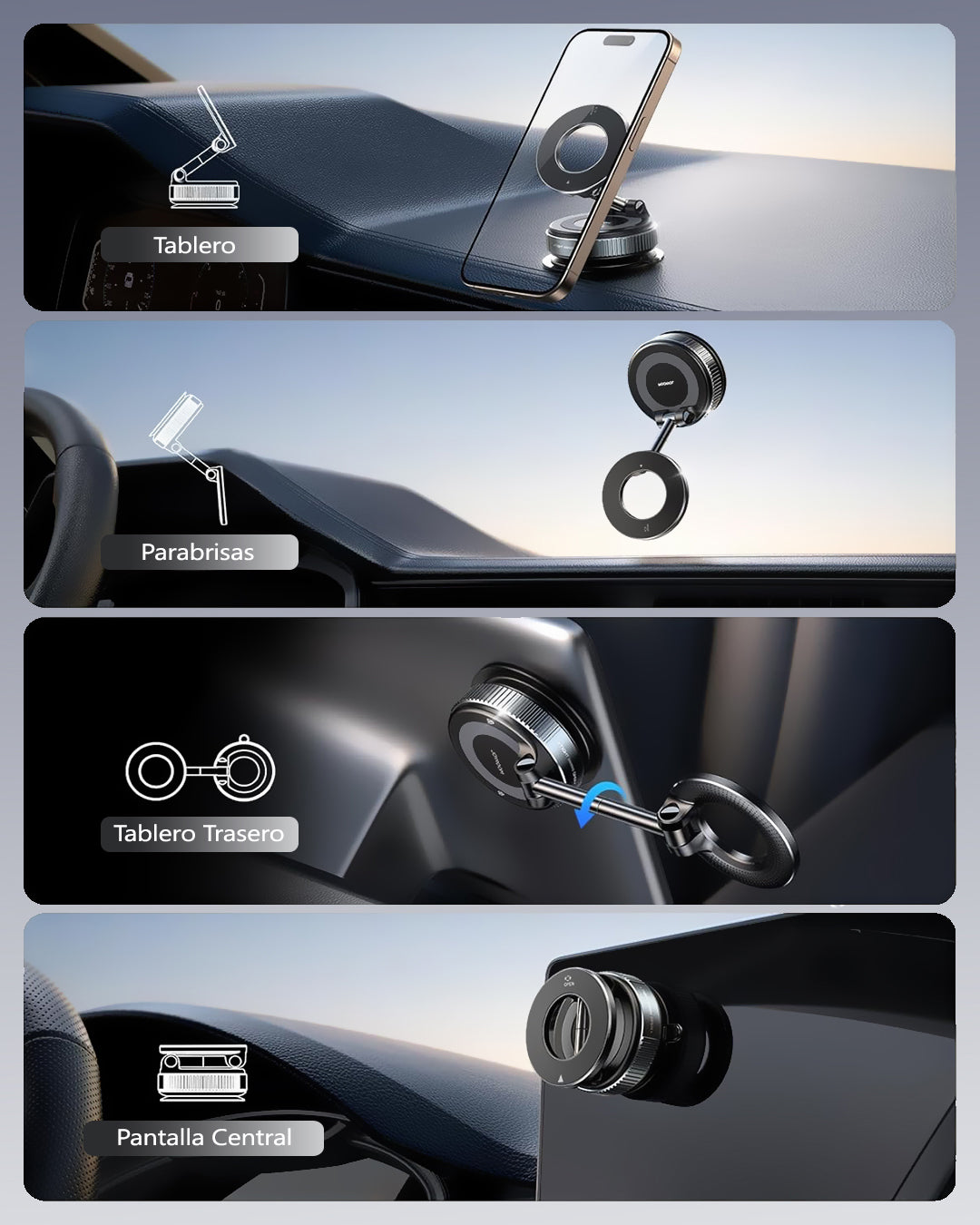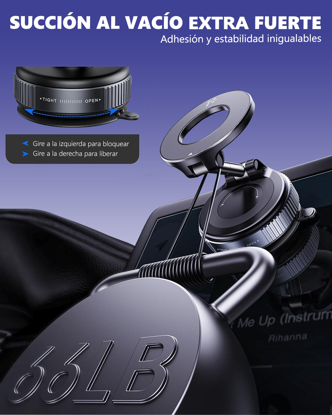 Soporte Celular magnético MagSafe para vehículos, oficina, videos - Extra fuerte con Ventosa, Giro 360° ajustable, iPhone y Android