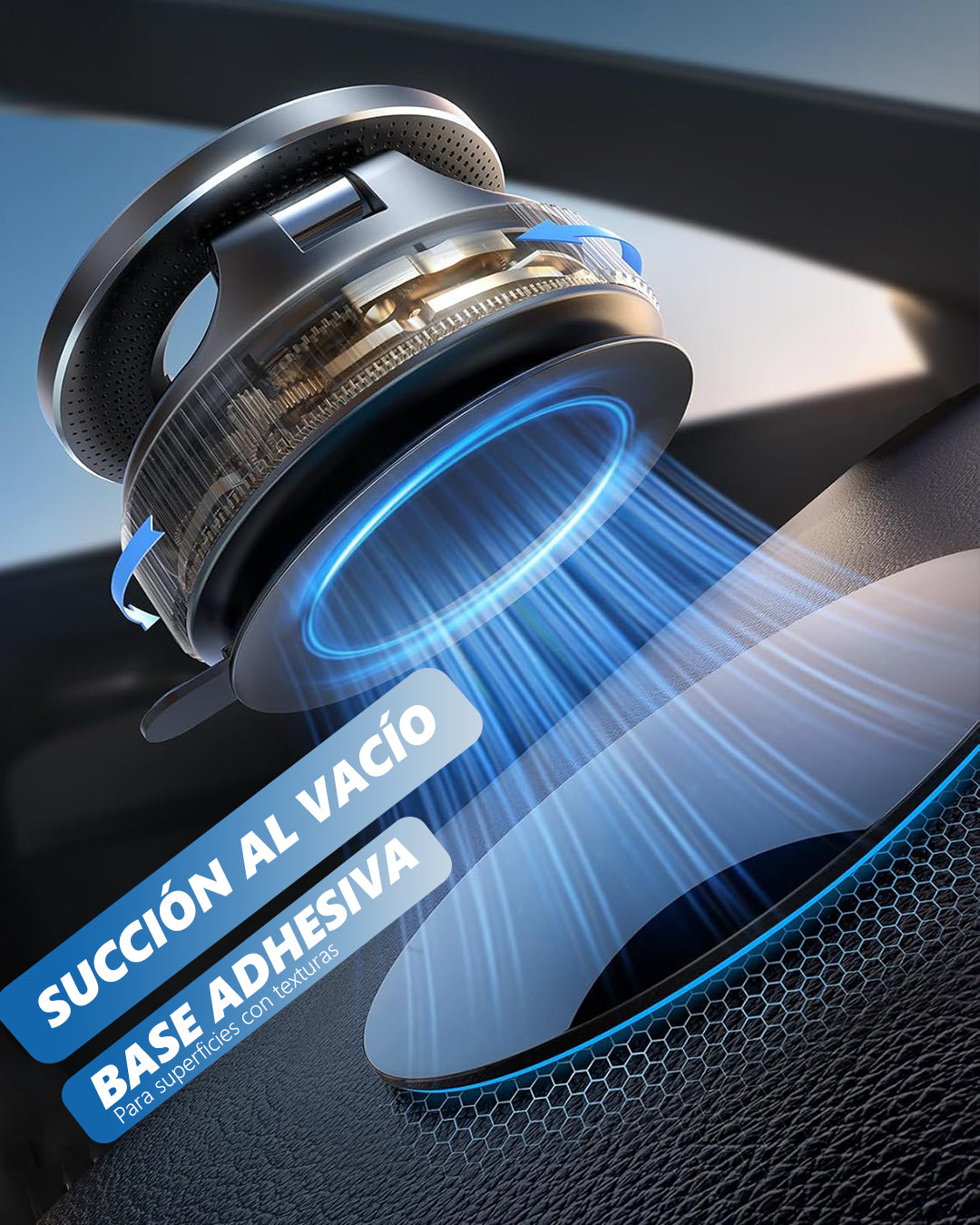 Su ventosa de vacío reforzada se adhiere perfectamente a vidrios, superficies lisas, parabrisas o paneles pulidos, sin dejar residuos ni marcas. Gracias a su sistema de bloqueo manual giratorio, asegura una fijación duradera y reutilizable. Además, incluye una base adhesiva para superficies con textura ligera, expandiendo su rango de uso en tableros.